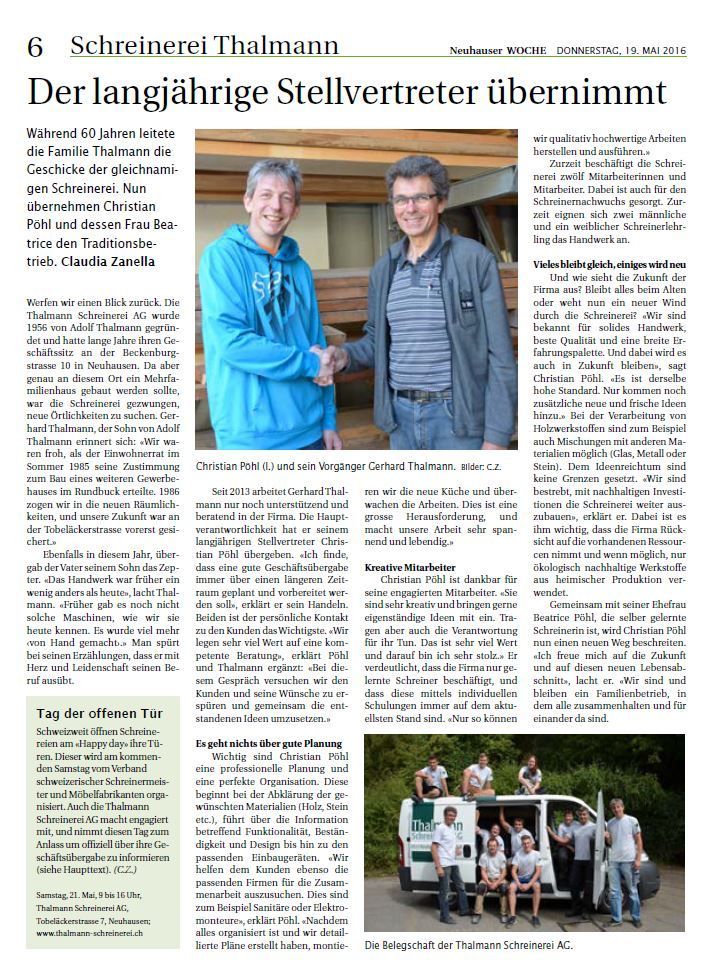 2013 wurde die Schreinerei vom langjährigen Stellvertreter Christian Pöhl übernommen. Gemeinsam mit seiner Frau Beatrice Pöhl, selber gelernte Schreinerin, und einem engagierten Team, wird er den Familienbetrieb mit viel Leidenschaft und Elan weiterführen.